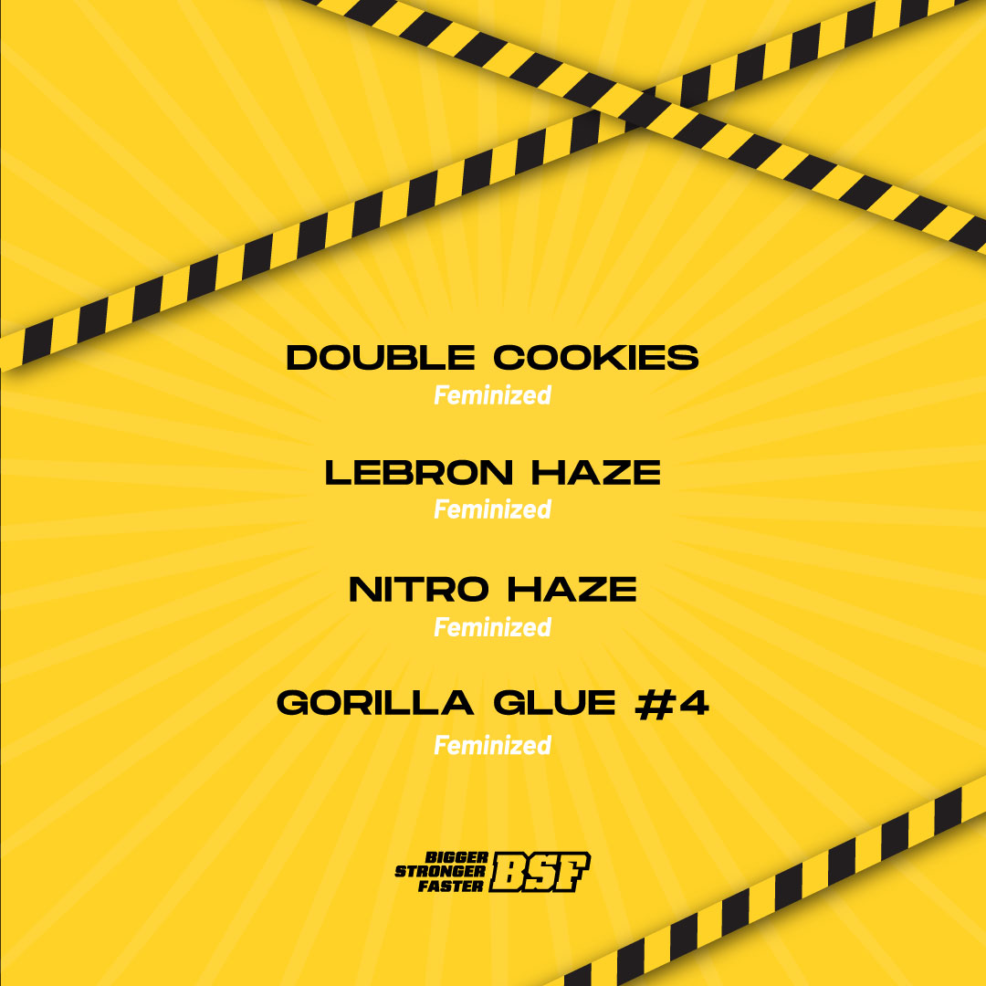 High Voltage Feminized Mix es una selección de 4 de las variedades con más alto THC de BSF Seeds: Double Cookies, Nitro Haze, Lebron Haze y Gorilla Glue #4.